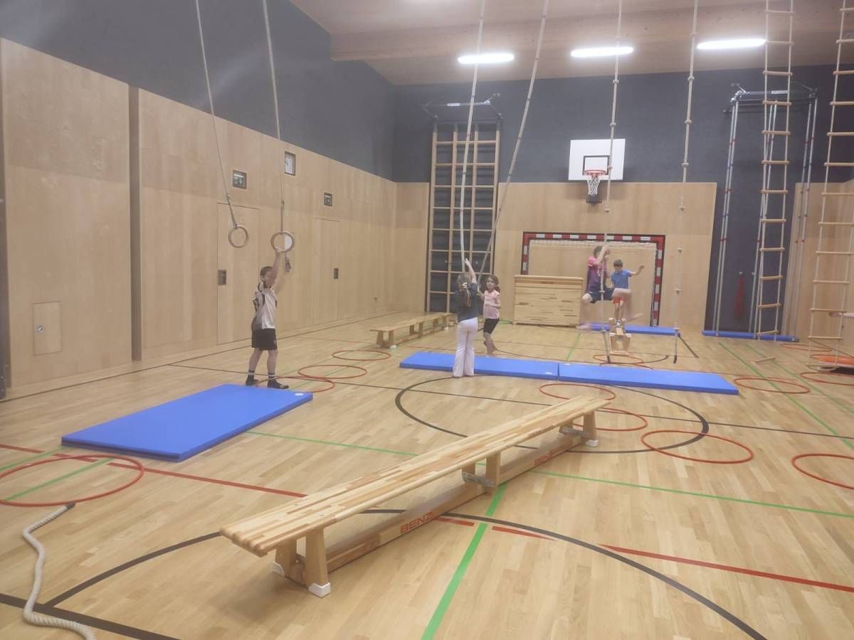 Wenn die Fr. Lehrerin der 2. Kl. mit ihren Schützlingen in den Turnsaal wandert, kann man etwas erleben: Da werden alle Geräte ausgepackt und aufgebaut, die der Turnraum zu bieten hat. An den Seilen schwingen, über Bänke balancieren, auf Sprossenwände klettern, an Ringen hängen und schaukeln, über Kästen springen uvm. Mit so vielfältigen Bewegungsmöglichkeiten macht das Turnen richtig Spaß ;-)