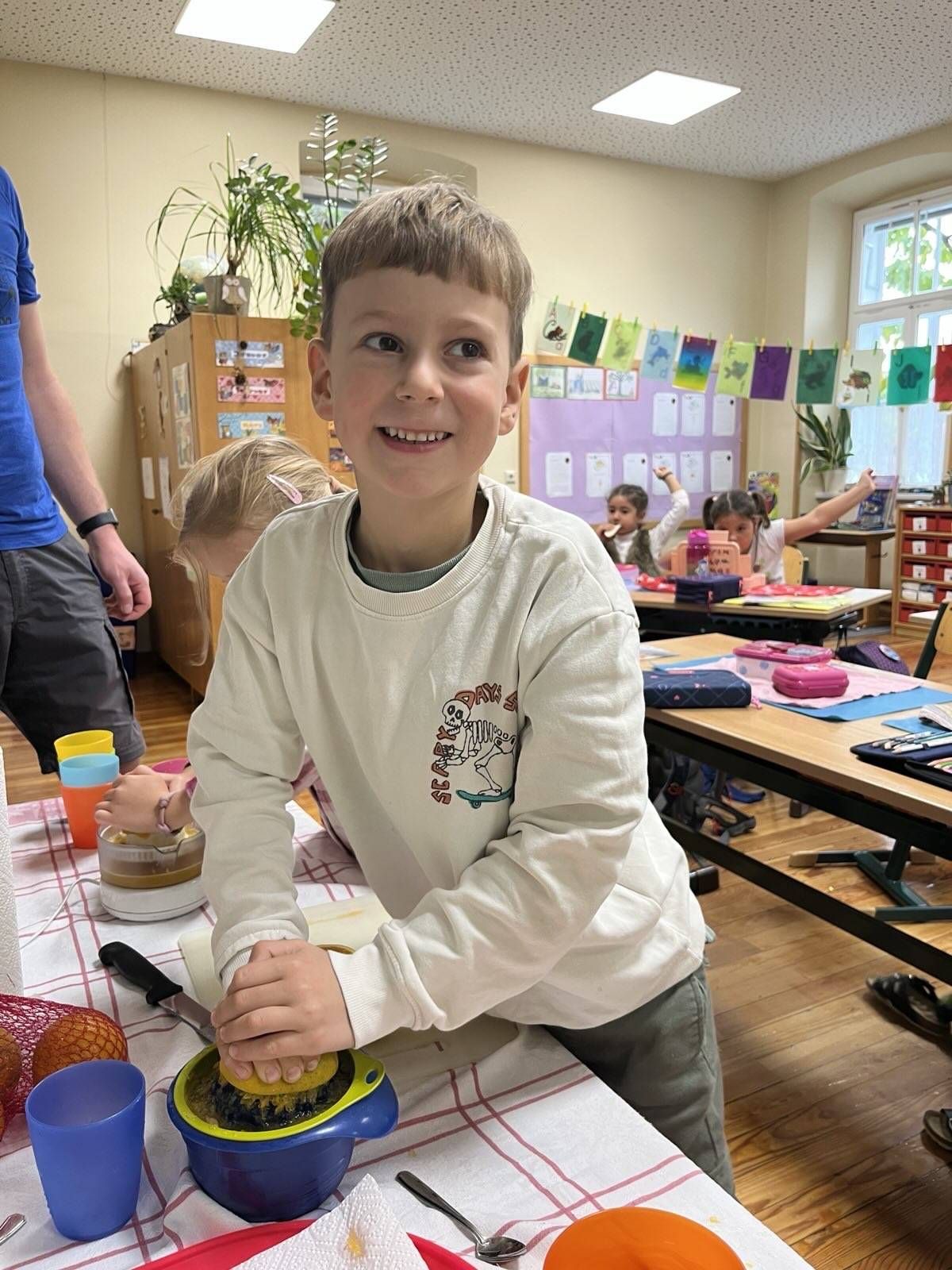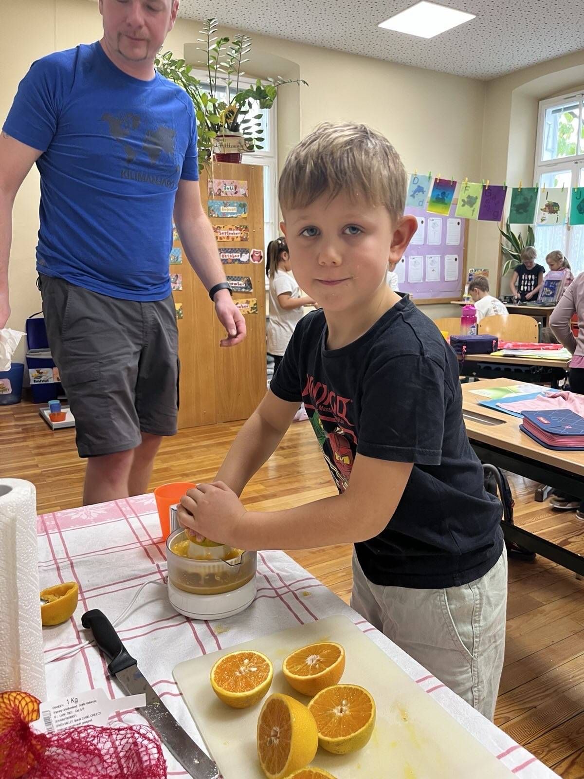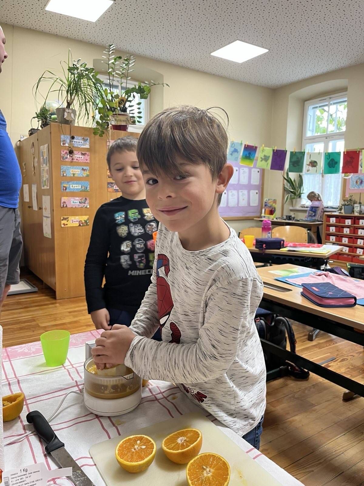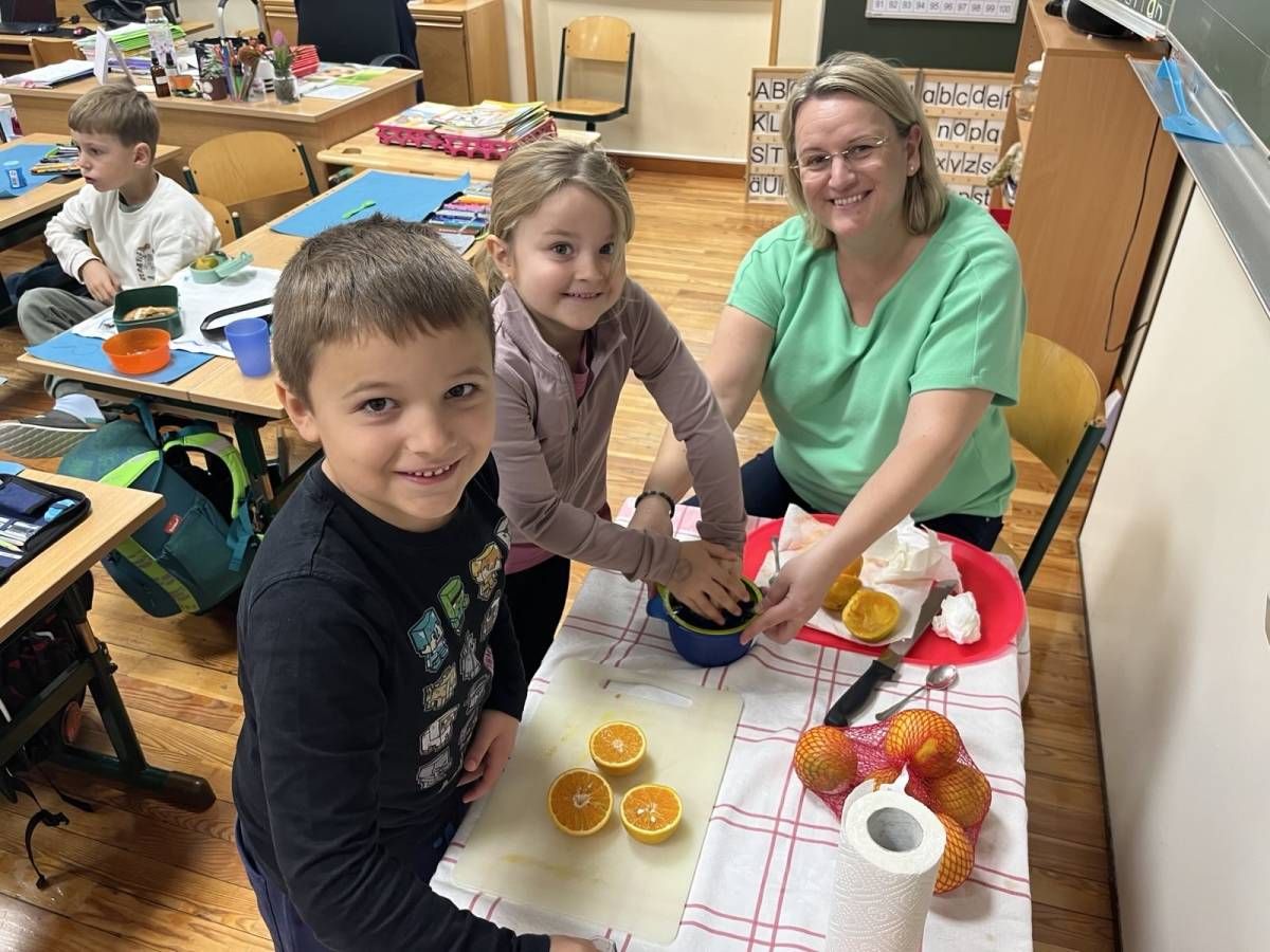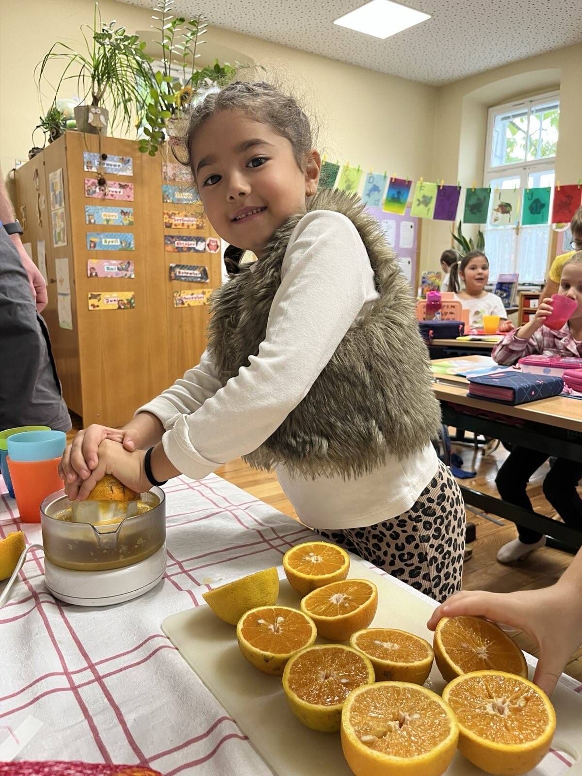 Auch heuer starten wir wieder unsere Reise durch das Alphabet in der 1. Kl. Wie kann man Buchstaben und deren Laut besser mit vertrauten Dingen verbinden als mit Aktivitäten aus dem Leben - und wenn man dabei auch noch etwas zu essen oder zu trinken bekommt, "zieht das alles viel nachhaltiger in unser Gehirn ein". So wird ein Apfel in gleiche Teile geschnitten (beim Teilen muss es ja auch immer gerecht zugehen) und der Saft aus der Orange gequetscht. Zum Schluss wird alles mit großem Genuss verzehrt ... und die Erfahrungen werden hoffentlich noch lange in unserem Gedächtnis gespeichert.