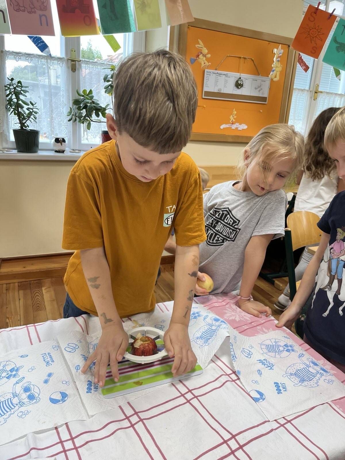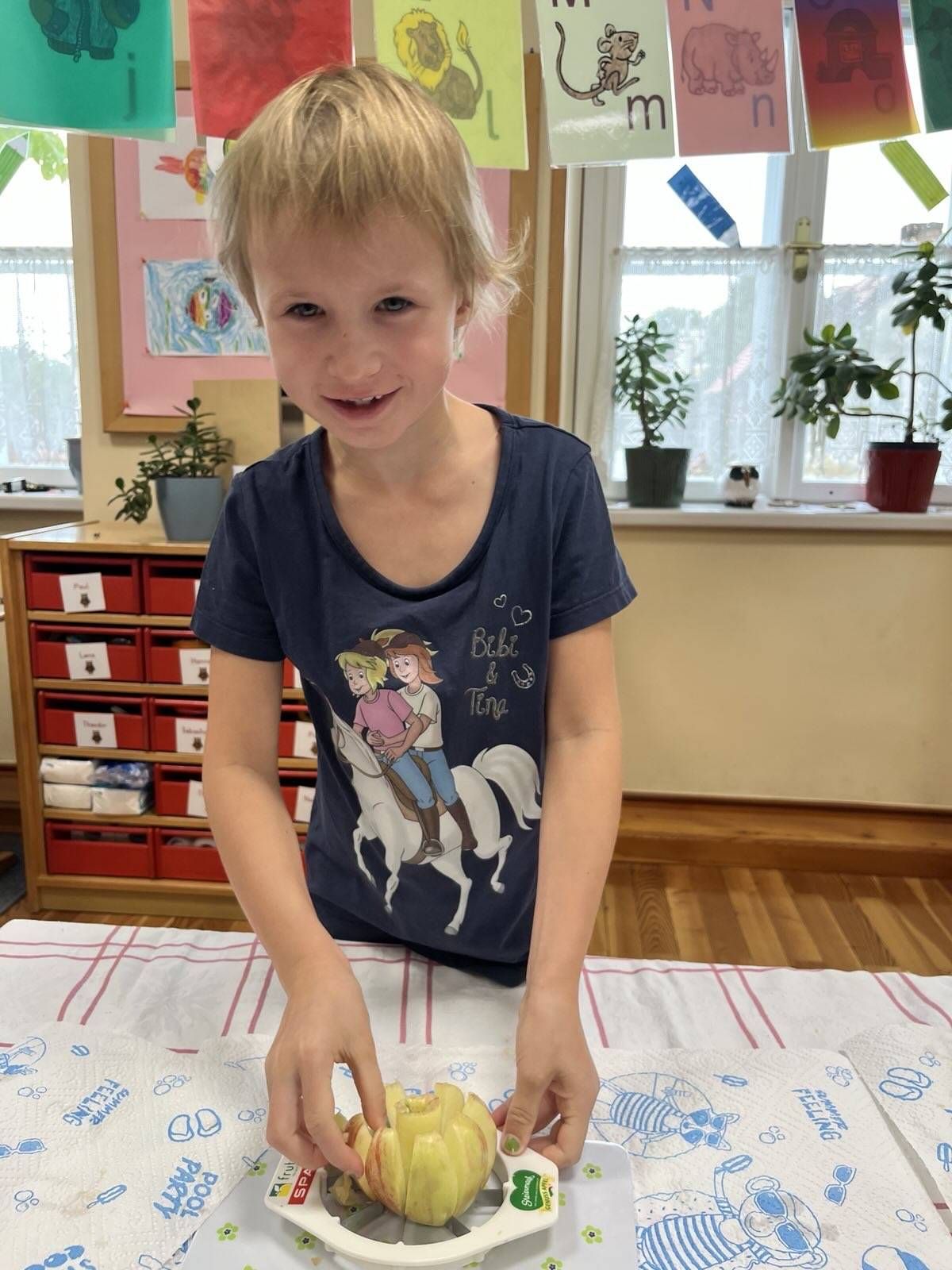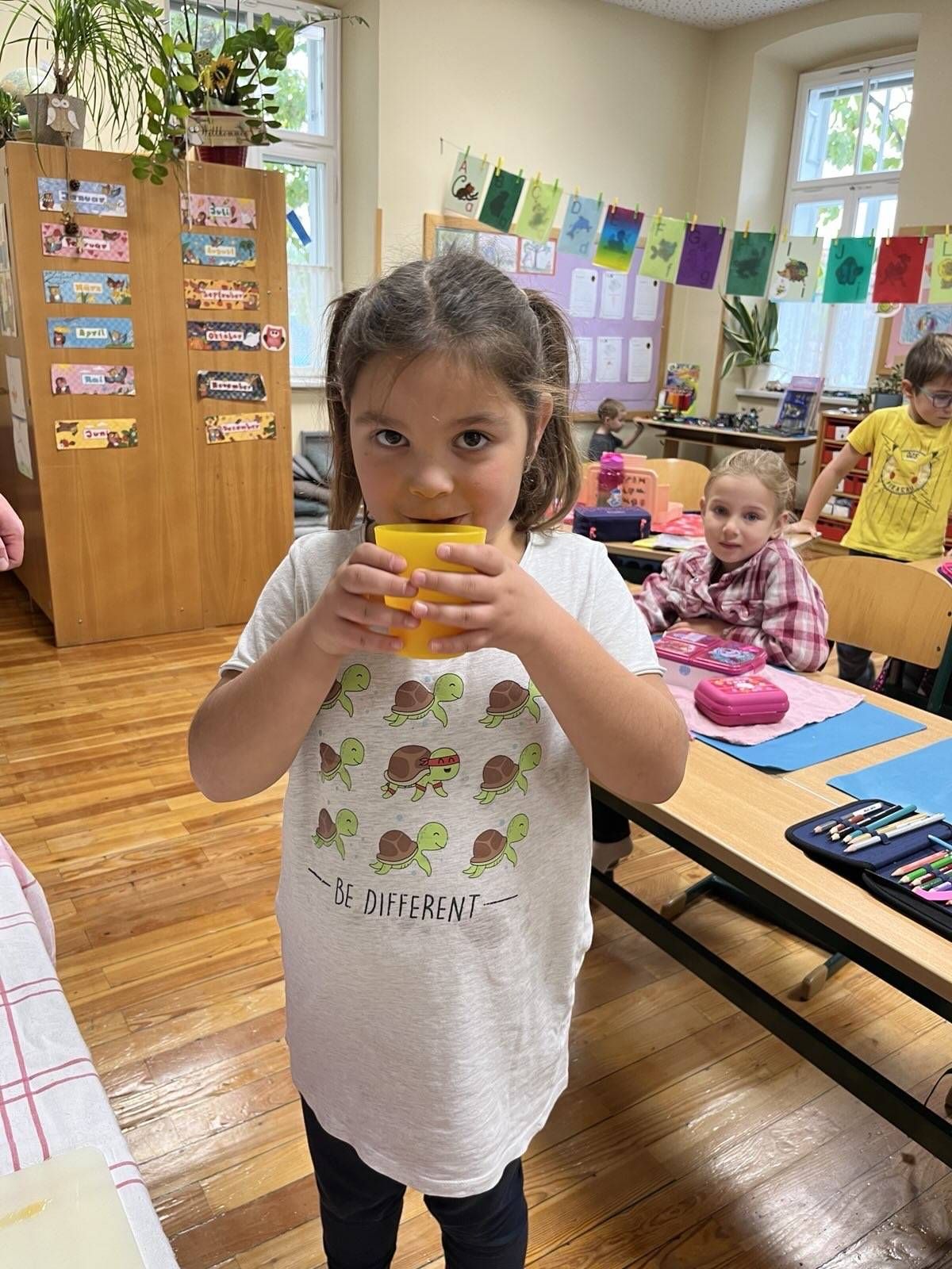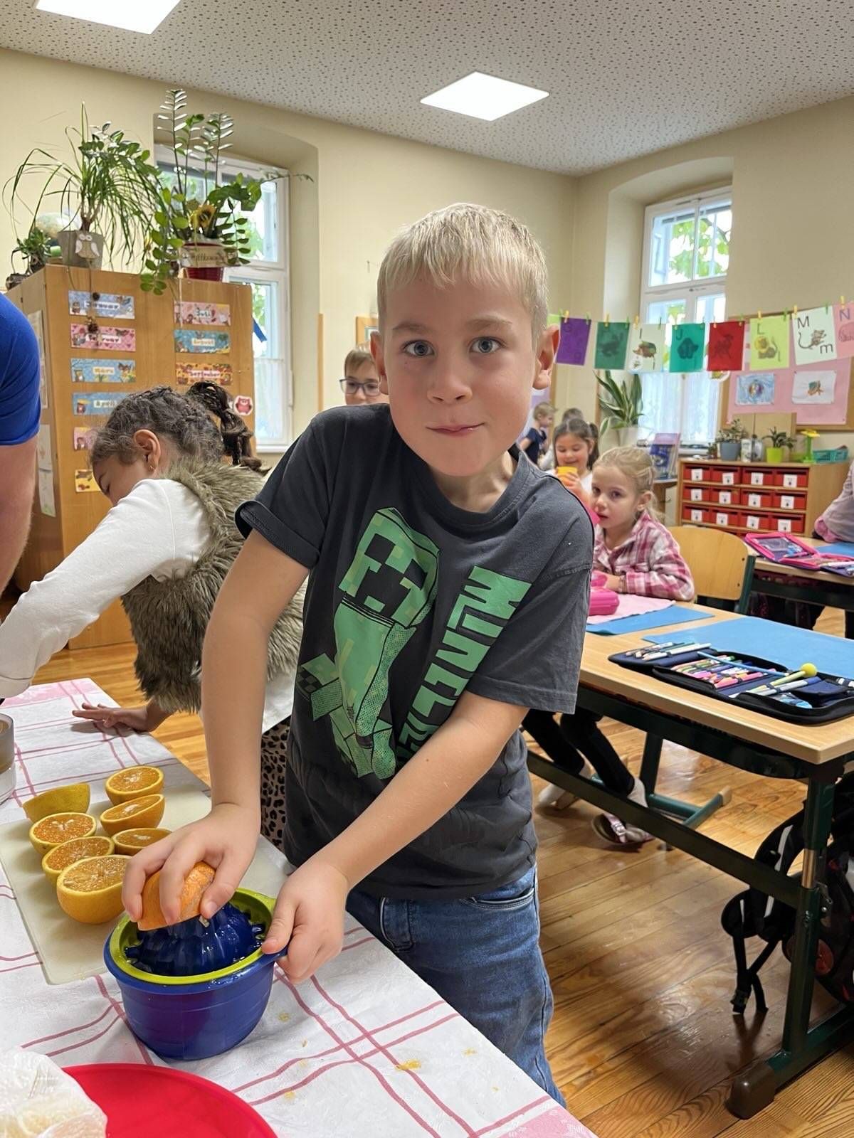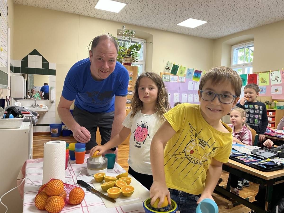 Auch heuer starten wir wieder unsere Reise durch das Alphabet in der 1. Kl. Wie kann man Buchstaben und deren Laut besser mit vertrauten Dingen verbinden als mit Aktivitäten aus dem Leben - und wenn man dabei auch noch etwas zu essen oder zu trinken bekommt, "zieht das alles viel nachhaltiger in unser Gehirn ein". So wird ein Apfel in gleiche Teile geschnitten (beim Teilen muss es ja auch immer gerecht zugehen) und der Saft aus der Orange gequetscht. Zum Schluss wird alles mit großem Genuss verzehrt ... und die Erfahrungen werden hoffentlich noch lange in unserem Gedächtnis gespeichert.