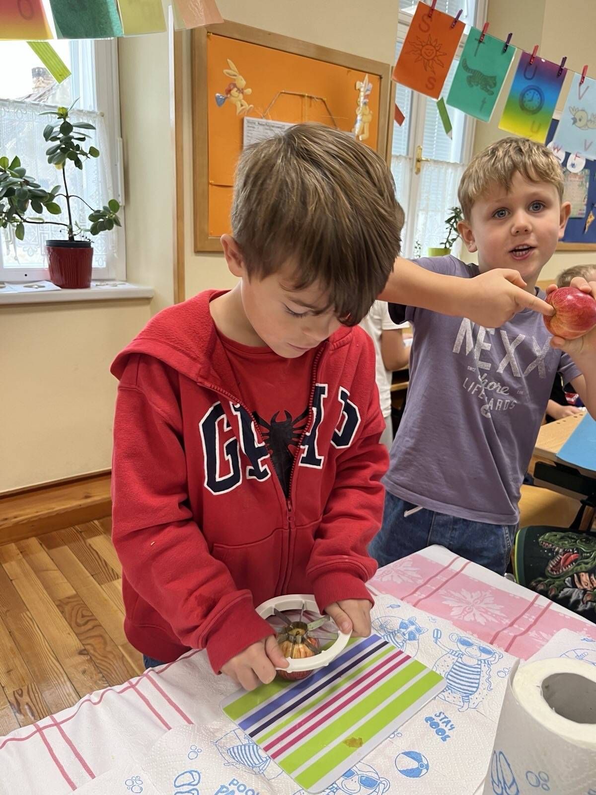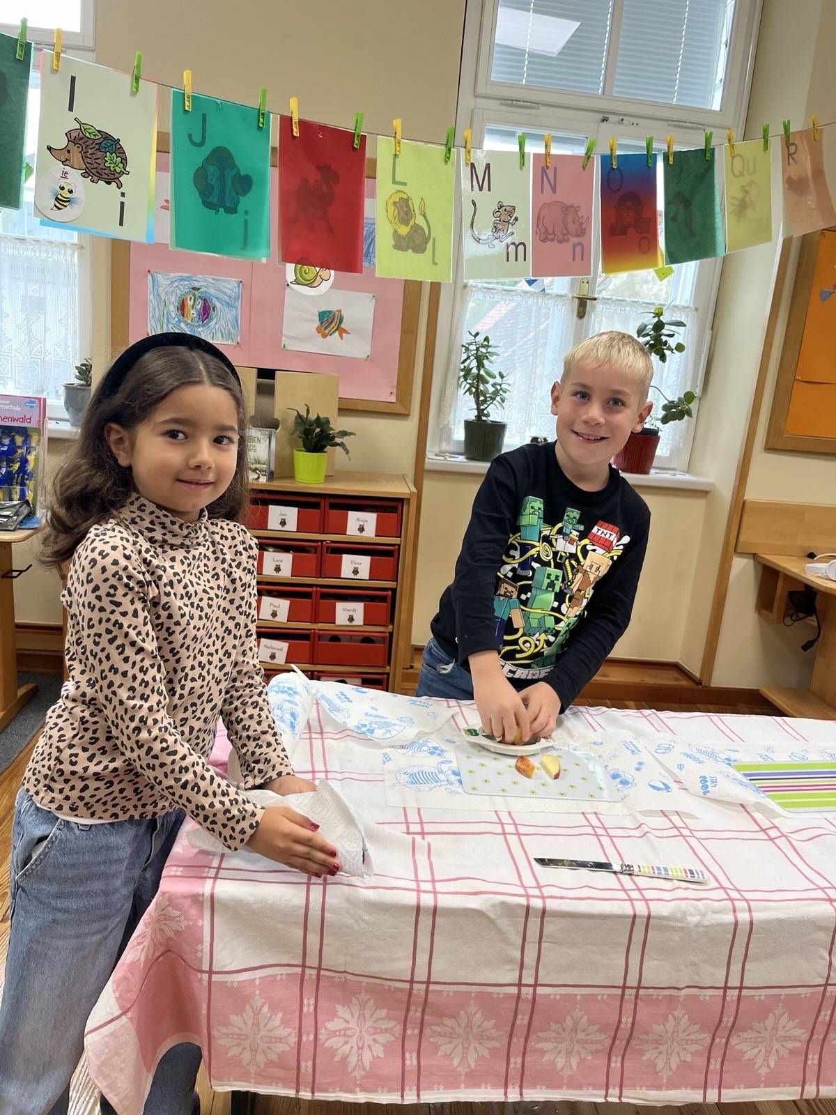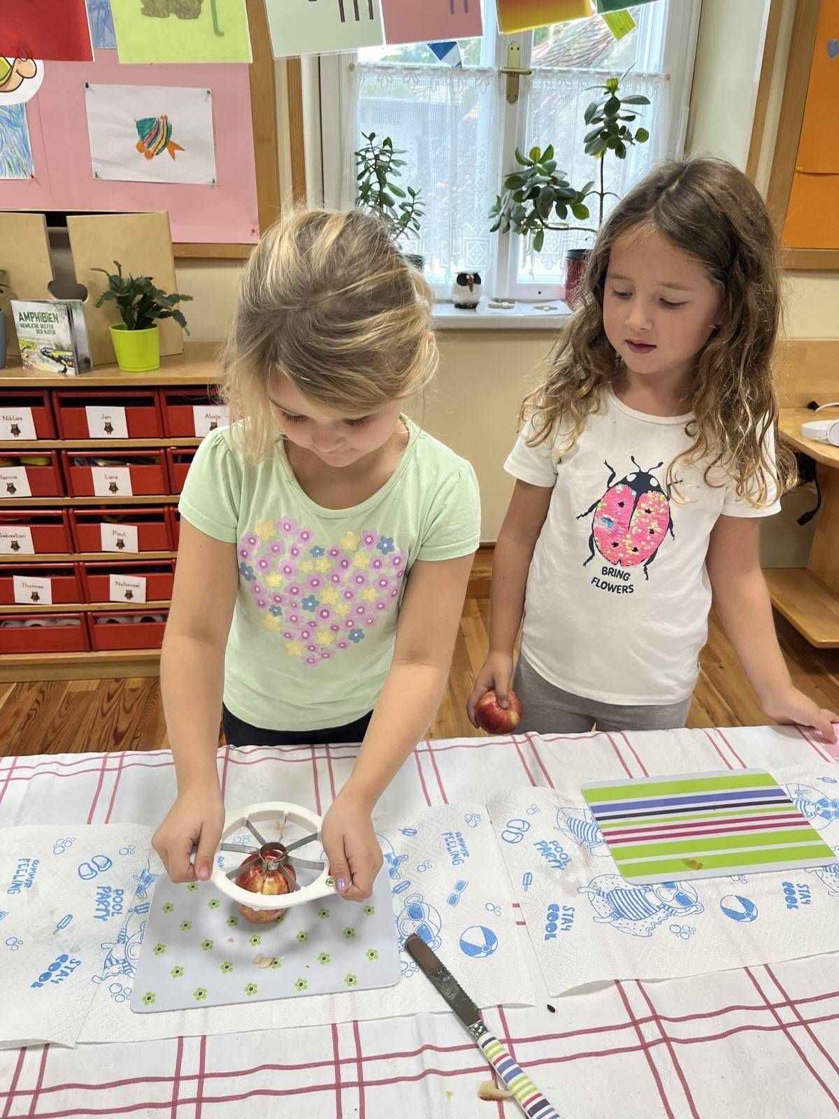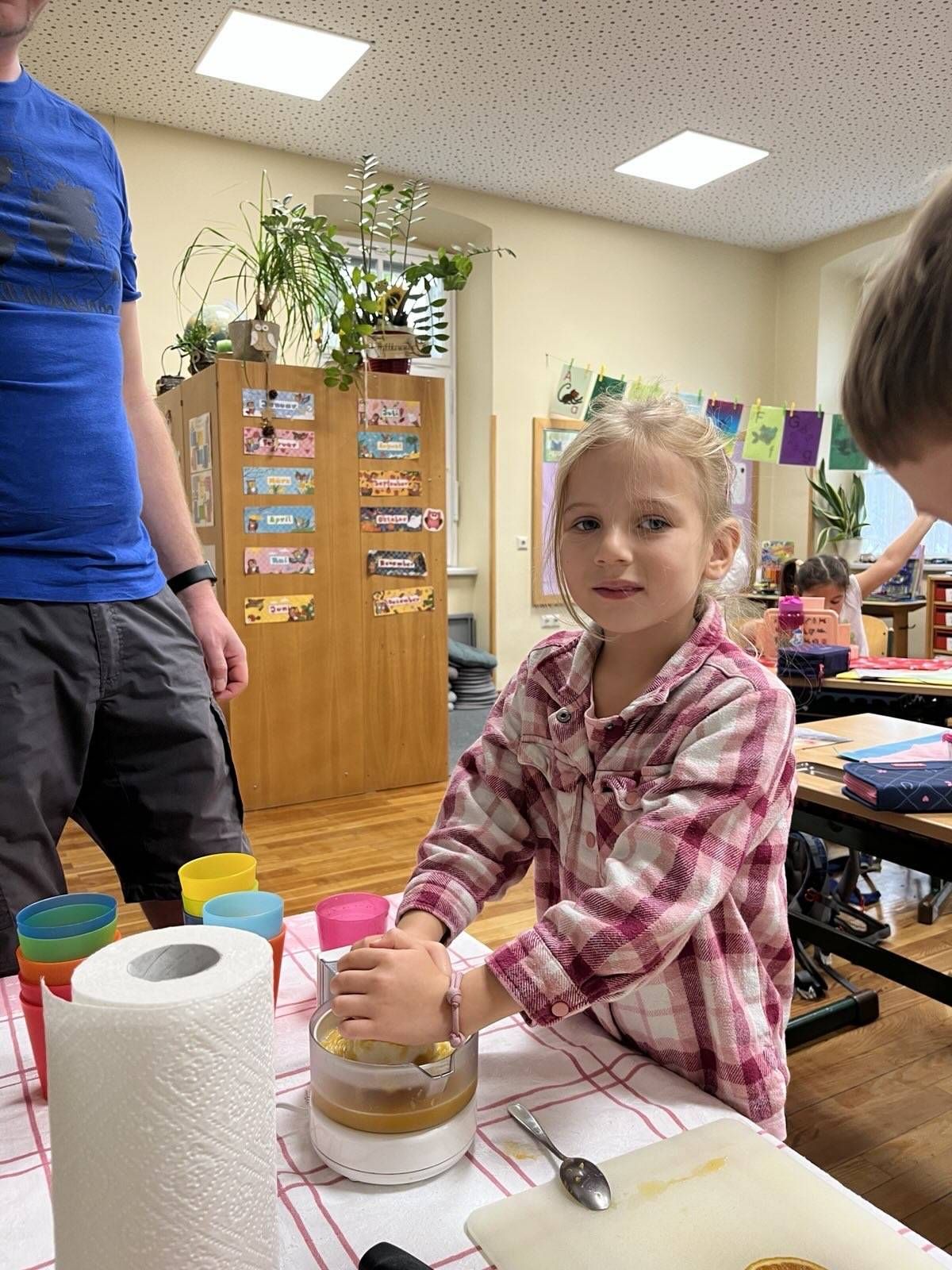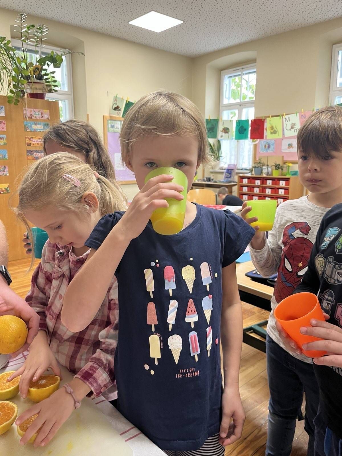 Auch heuer starten wir wieder unsere Reise durch das Alphabet in der 1. Kl. Wie kann man Buchstaben und deren Laut besser mit vertrauten Dingen verbinden als mit Aktivitäten aus dem Leben - und wenn man dabei auch noch etwas zu essen oder zu trinken bekommt, "zieht das alles viel nachhaltiger in unser Gehirn ein". So wird ein Apfel in gleiche Teile geschnitten (beim Teilen muss es ja auch immer gerecht zugehen) und der Saft aus der Orange gequetscht. Zum Schluss wird alles mit großem Genuss verzehrt ... und die Erfahrungen werden hoffentlich noch lange in unserem Gedächtnis gespeichert.