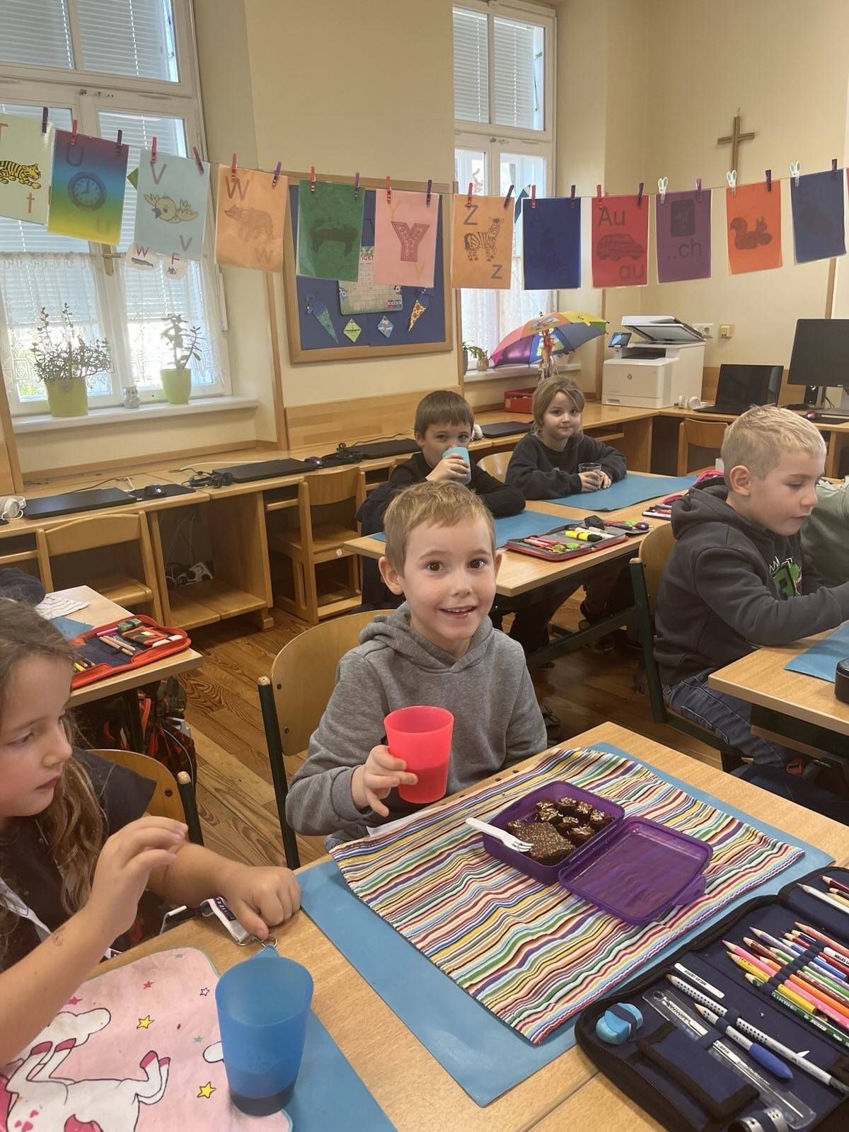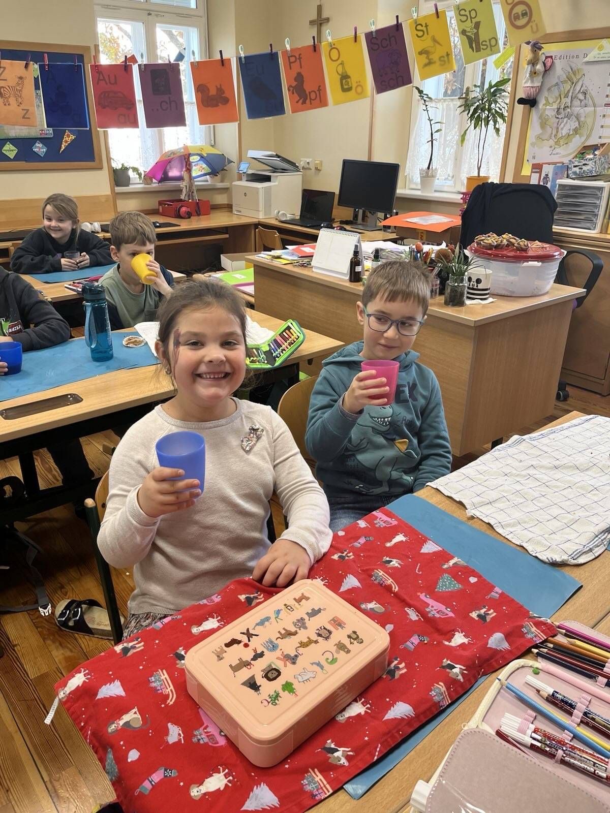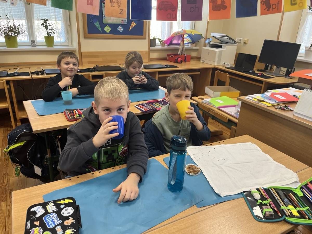 Einen neuen Buchstaben muss man hören, sehen, fühlen, spüren und vor allem natürlich auch schmecken. Was also anderes tun, wenn man das "T" lernt, als einen wohlschmeckenden Tee zu kochen? Und genau das haben unsere Buchstabenjäger/innen gemacht ... ach wie gut Tee doch in der Schule mit allen Kolleginnen und Kollegen schmeckt!