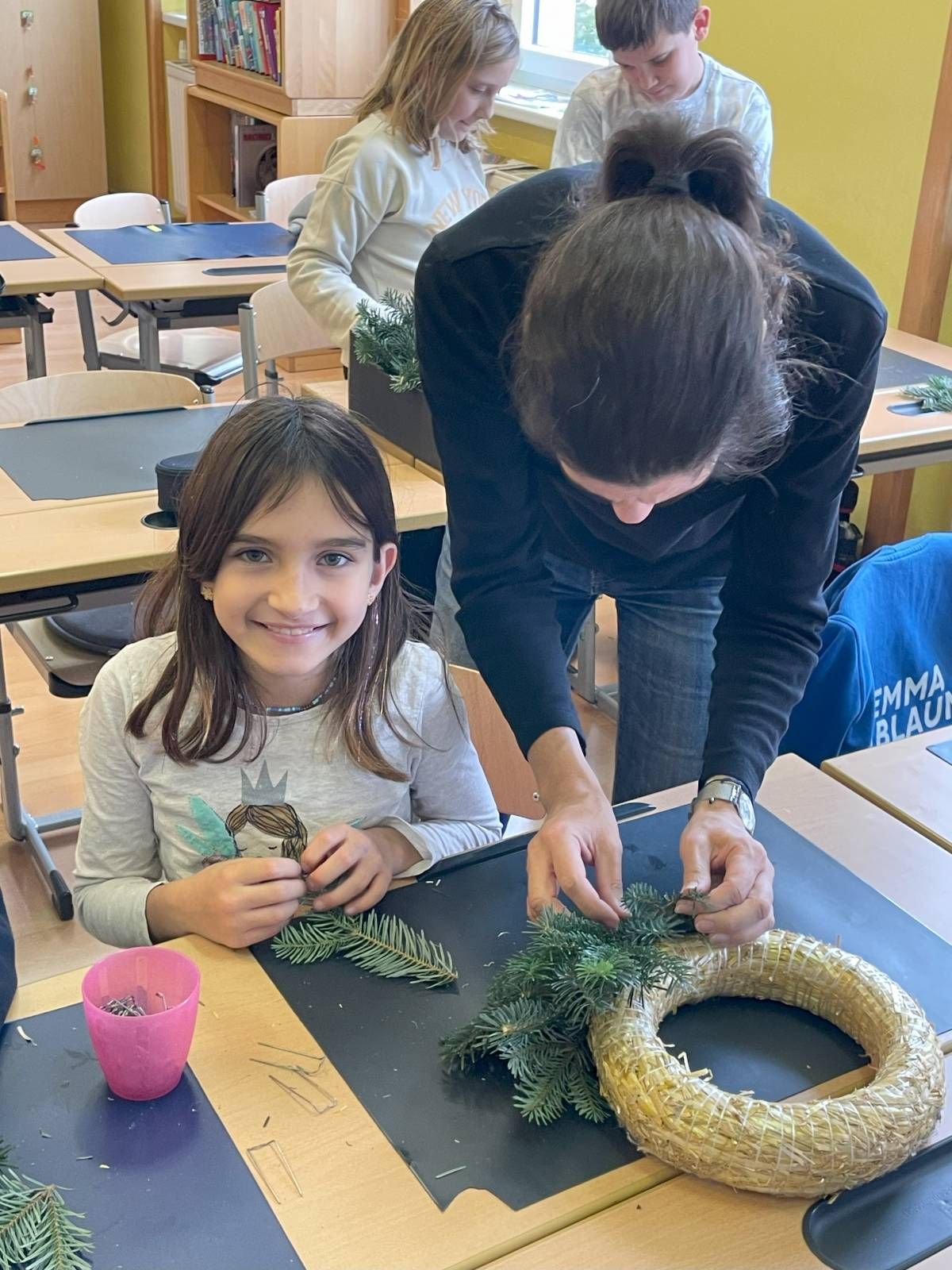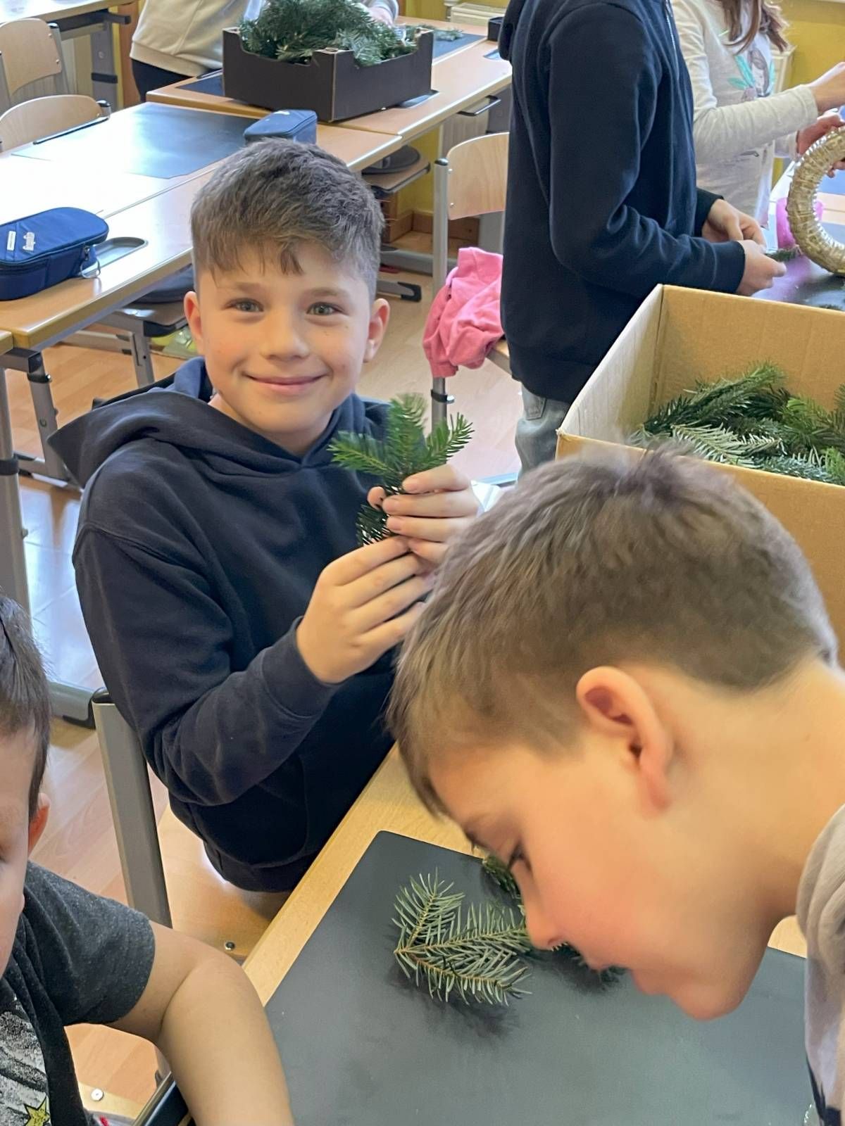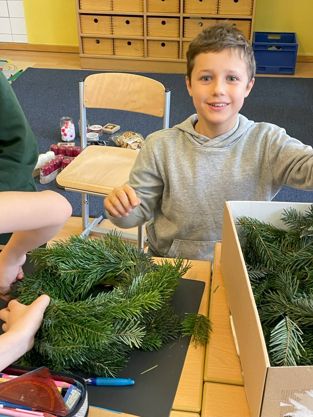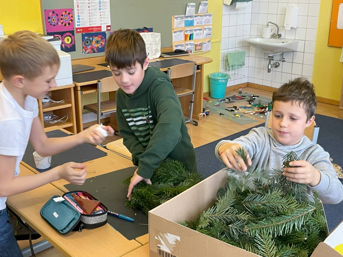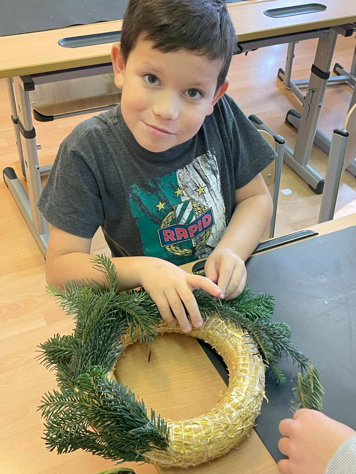 Es blieb nur noch die Frage, woher unsere Adventkränze für die einzelnen Klassen kommen würden ... die Antwort war ganz klar: Wie jedes Jahr haben auch heuer unsere Großen 4 tolle Kränze aus Tannenreisig gesteckt und anschließend mit Kerzen und Dekorationsmaterial verziert.